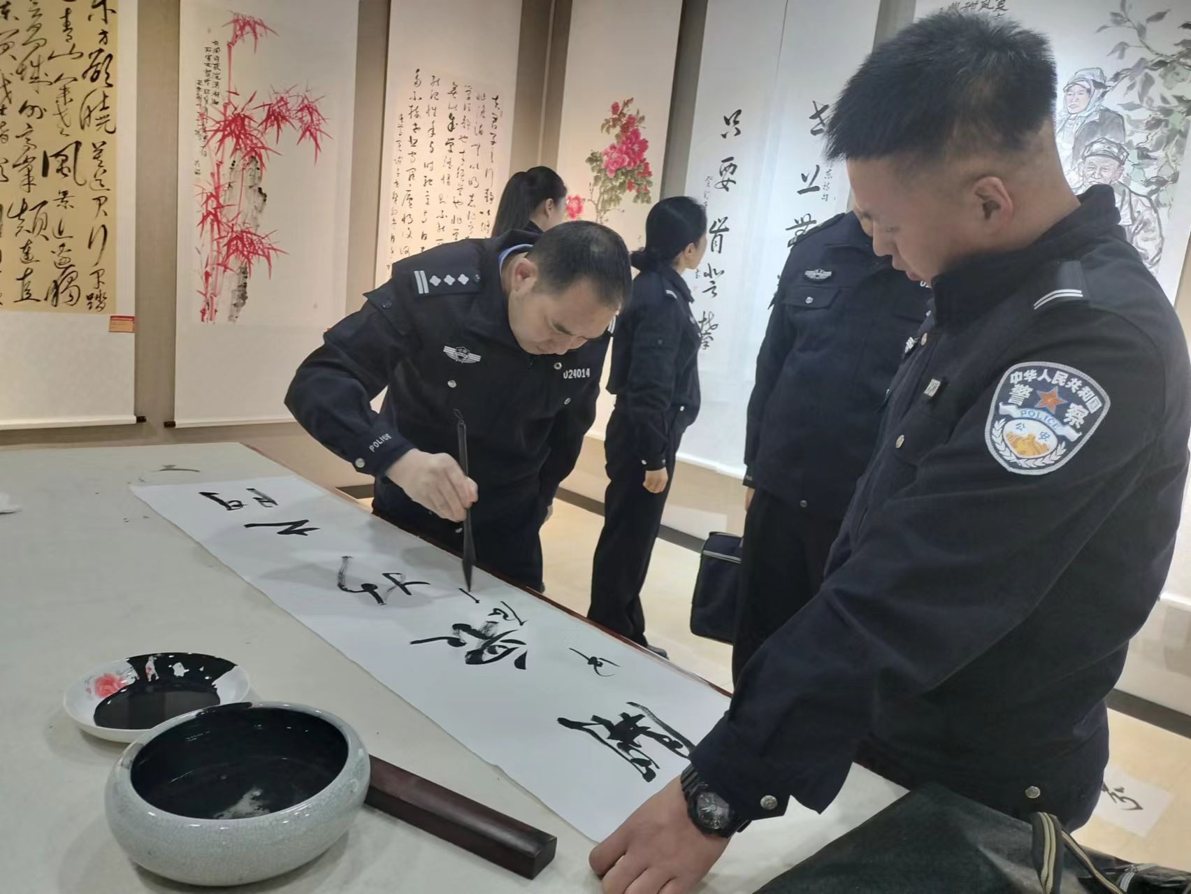 参观完书画展后,与会人员来到笔会现场。美术馆的书画家和武山公安文联的会员挥毫泼墨,创作出一幅幅精美的书画作品,这些作品不仅展示了书画家的绘画技艺和深厚的文化底蕴,更传递了他们对和谐社会的美好愿景。