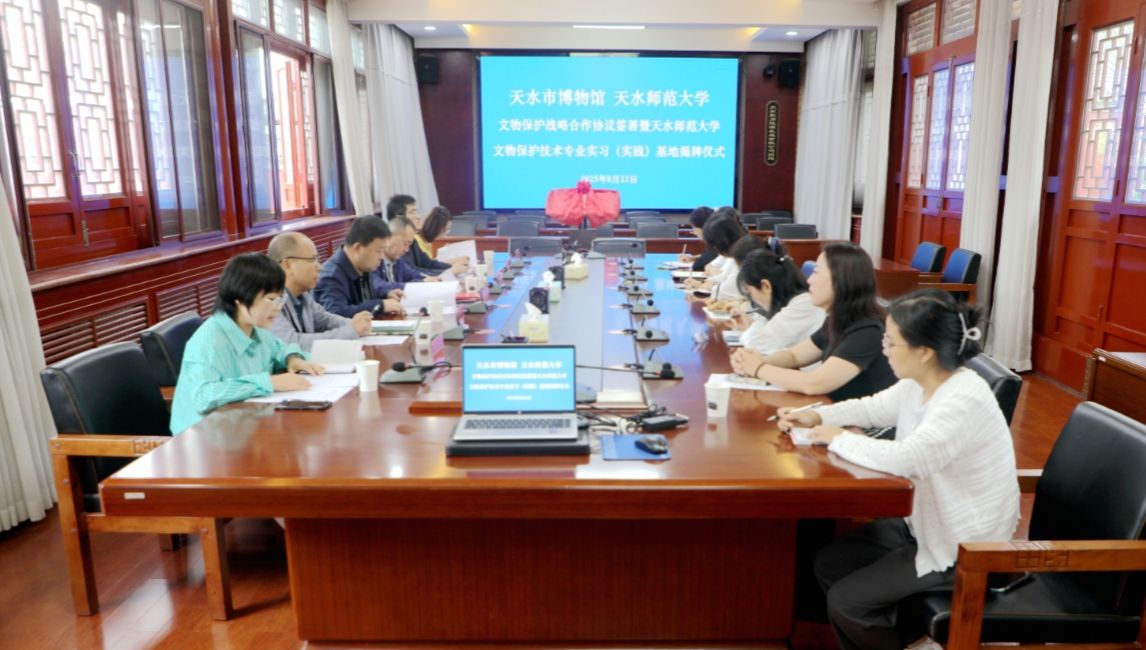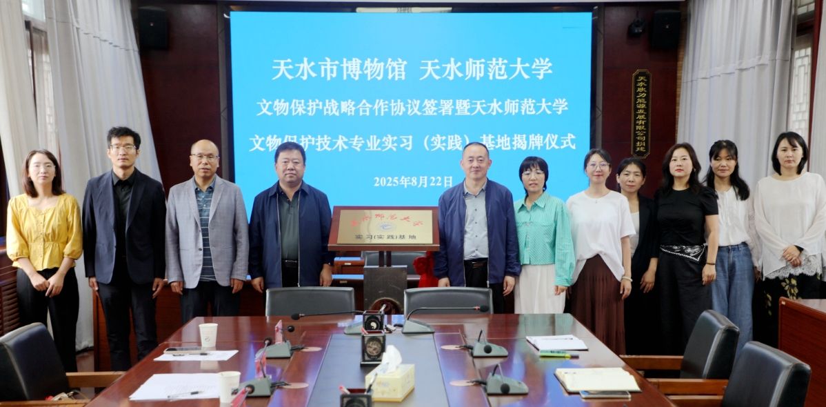 8月22日,天水市博物馆与天水师范大学文物保护战略合作协议签署暨天水师范大学文物保护技术专业实习(实践)基地揭牌仪式在市博物馆畅和轩举行,天水师范大学化学工程与技术学院党委书记巩军全、院长李志锋、科研院长杨本群、文保系主任文娟,天水市博物馆馆长刘玉璞、副馆长马素芳等参加揭牌仪式。