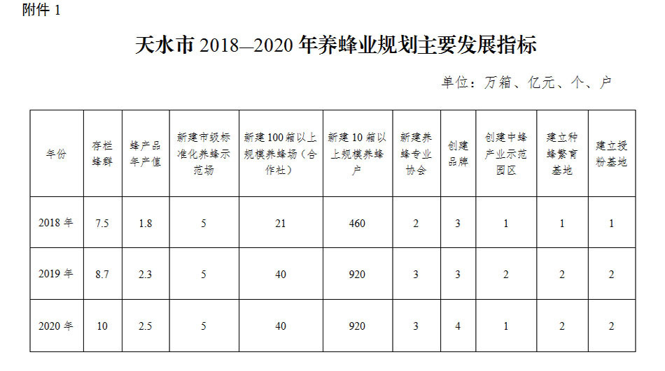 附件:1.天水市2018—2020年养蜂业规划主要发展指标