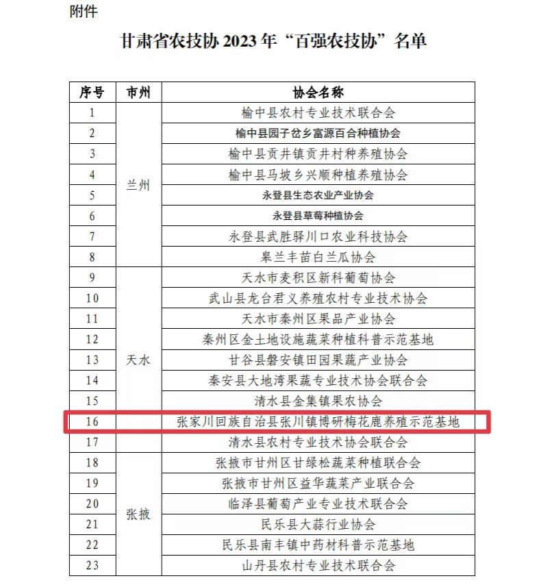 为提升农技协社会化组织动员能力,充分发挥农技协组织在促进农业产业发展、提高农民组织化程度和科学素质等方面的积极作用,近日,省农技协联合会开展了2023年“甘肃省百强农技协”推荐选树工作。经过各级科协的逐级推荐、组织评审,张家川县张家川镇博研梅花鹿养殖示范基地荣获甘肃省农技协2023年“百强农技协”荣誉称号。