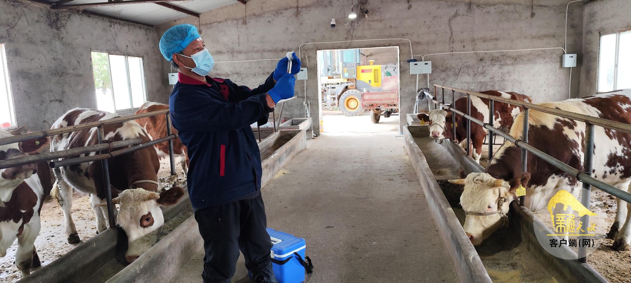 在张家川县大阳镇永盛茂养殖农民合作社的饲养场里,村级动物防疫员张三平和其他四位同事正在着手准备给场里牛进行口蹄疫疫苗的注射工作,他们5个人一组,负责四个行政村畜禽的防疫工作,按照县乡秋季动物疫病防控工作的流程,他们五人分工负责,穿戴好防护服后,有的调配登记疫苗的相关信息,有的登记预防牛的编号,有的准备注射器,在前期准备工作完成后,他们进入牛舍,逐个给牛注射口蹄疫疫苗,并同步加挂耳标、更新电子免疫档案。