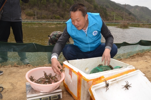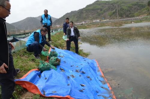 为贯彻落实天水市《关于加快推进全市水产养殖业绿色发展实施意见》,优化水产养殖空间布局,大力发展水产养殖业绿色、生态、健康养殖发展理念。近日,由天水宝源生态农业开发有限公司引进的2万尾中华绒螯蟹,投放到稻蟹、稻藕池塘中。同时,抓住农时积极采购稻苗近期内完成插秧种稻工作。市畜牧兽医局总畜牧兽医师邢喜生、市区两级渔业站技术人员指导放苗工作。