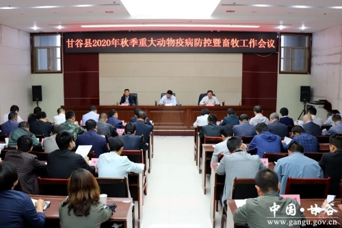 9月4日,甘谷县召开2020年秋季重大动物疫病防控暨畜牧工作会议,贯彻落实全市畜牧重点工作会议精神,回顾总结上半年动物防疫及畜牧工作,对下半年的各项工作任务进行安排部署,进一步动员全县上下提振精神、坚定信心,再添措施、再鼓干劲,确保圆满完成年内各项工作任务。县委副书记舒时光主持会议;副县长杜兴讲话;各乡镇、各成员单位分管领导、相关负责人,畜牧中心全体干部参加会议。