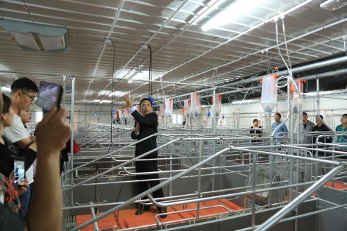 观摩人员依次参观了唐人神核心原种场洗消中心、饲料转运站、公猪站、妊娠舍、产仔舍、保育舍、仔公猪待转舍、育成舍、测定舍、育肥舍等,唐人神集团核心原种场项目负责人、当选首届天水市生猪产业协会会长的龙向阳对原种场项目选址、规划、布局和工程建设进行了全面细致的讲解,对观摩团成员提出的疑问逐一进行了解答。