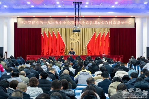 12月25日,天水市副市长逯克宗在市委党校礼堂为全市农业农村系统干部职工宣讲党的十九届五中全会精神。他强调,农业农村系统干部职工要深入学习贯彻党的十九届五中全会精神和习近平总书记对甘肃重要讲话和指示精神,同心同德,顽强奋斗,齐心协力谱写加快建设幸福美好新天水的时代篇章。
