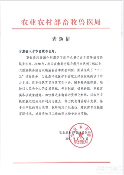 近日,因在加快推进畜禽粪污资源化利用,以农用有机肥就近就地还田利用为重点,努力促进种养结合发展中表现突出,天水市畜牧兽医局和6名个人获得农业农村部畜牧兽医局表扬。