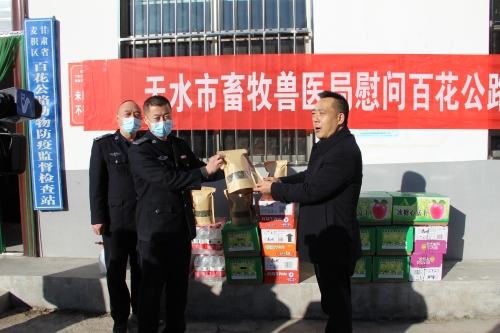 工作组一行实地察看了检查站硬件设施建设情况,详细了解了检查站运行机制、生活保障等情况,并与工作人员亲切交谈,询问他们工作值班和生活情况,嘱咐他们注意防寒保暖,以饱满的热情,昂扬的斗志值好班,站好岗,同时为工作人员送去了节日慰问品,代表全市畜牧系统向奋斗在非洲猪瘟等重大动物疫病防控一线的工作人员致以节日祝福。王新强指出:百花公路动物防疫监督检查站工作人员履职尽责、扎实认真、任劳任怨,对畜禽及其产品调运、档案记录、信息采集上报、运输车辆消毒等工作做到了全面的检查,发挥了十分重要的作用,尤其是在非洲猪瘟的防控上,严防死守,把住了甘肃东大门。希望同志们继续努力,克服困难,做好各项工作。