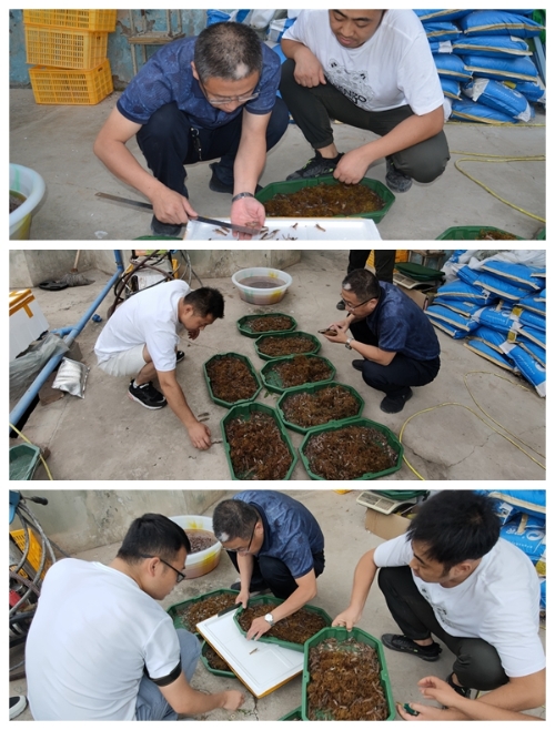 工作人员和养殖户就澳洲小龙虾的后续饲养管理做了深入交流。一是科学投喂。每天早、晚各投喂1次,投饲量约占体重的5%~10%,具体的投饲量要根据其摄食情况增减。大部分摄食在黄昏和夜间进行,晚上的投饲量要占全天70%至80%以上,饲料应沿四边投在池塘浅水处,投喂均匀,防止争食,残饵应及时清除,避免败坏水质,诱发虾病。二是强化日常管理。虾池需有专人进行管理,平时要勤检查,勤巡塘、及时补充池底水草数量,清除池中青苔;经常检查进、排水口的过滤网,注意防除敌害;雷雨天气需要特别注意成虾逃逸情况,增加水体溶解氧,保证虾在水中不会因为缺氧而逃出。三是做好病害防治。根据水质情况,不定期消毒,做好日常监测,防止病害发生。