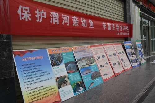 我市水生生物资源丰富,现有鱼类50余种。其中大鲵、秦岭细鳞鲑、多鳞白甲鱼、山溪鲵为国家二级保护物种,渭河裸重唇鱼为省级重点保护物种。共建成国家级自然保护区1个、国家级水产种质资源保护区1个、省级水产种质资源保护区1个。为切实做好生物多样性日宣传活动,进一步保护我市水生野生动物,市畜牧兽医局副局长张琥琴带领市、区两级渔业站的10名同志参加活动。活动通过现场布置“天水市水生生物多样性保护”展板、悬挂横幅标语、发放宣传资料、宣传物品、现场咨询、市场突击检查等方式进行,向市民群众宣传了保护水生生物多样性的重要意义,我市长江禁捕效果和黄河流域禁渔政策;向商户讲解不能放流的物种、严禁向天然开放水域投放外来物种和人工杂交种等不符合生态安全要求的水生物种。
