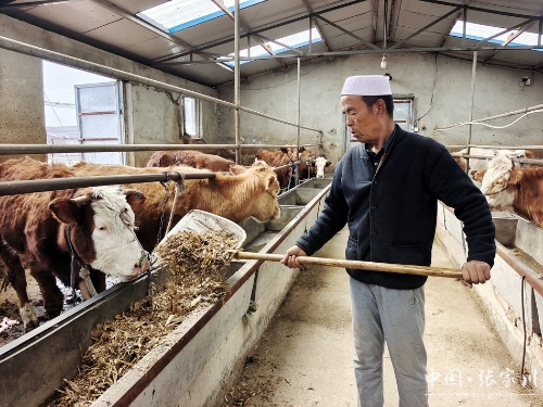 村民马曼生有着十几年的养殖经验,家中也养着5头牛。由于合作社离家近,加之养殖经验丰富,专门负责合作社日常饲养工作。“我在这个合作社务工4年了,每个月工资3500元,钱挣了也把家里的农活能顾上。养牛养羊是技术活,饲料调配得讲究。牛的饲料都是精心挑选的油渣、玉米等。饲草料是自己种植的,不含添加剂,喂养出来的牛羊肉是真正的绿色食品,在市场上很受欢迎。”饲养工人马曼生说。
