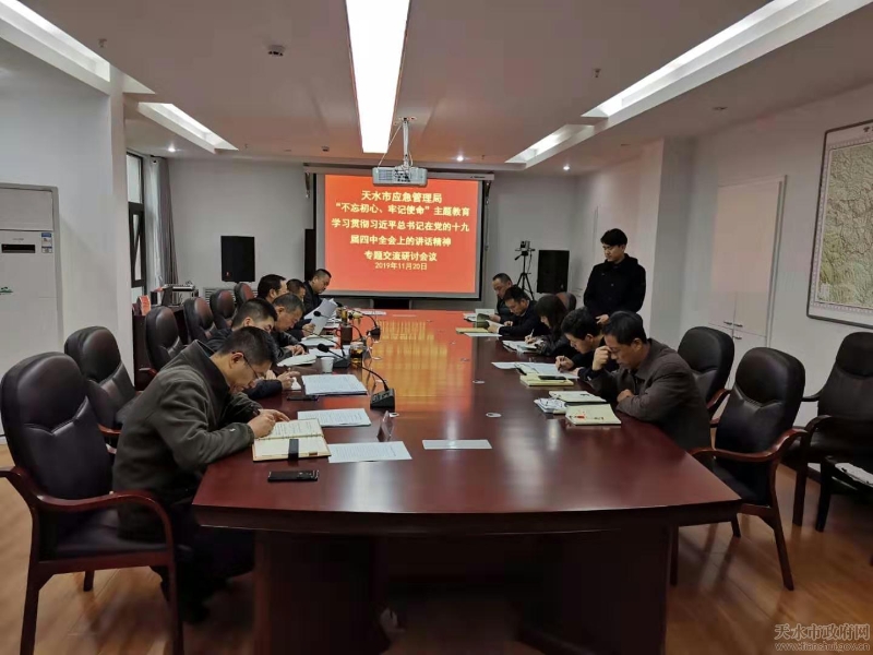 按照市委“不忘初心、牢记使命”主题教育领导小组办公室安排部署,11月20日上午,天水市应急管理局召开“学习贯彻党的十九届四中全会精神”专题研讨会议。