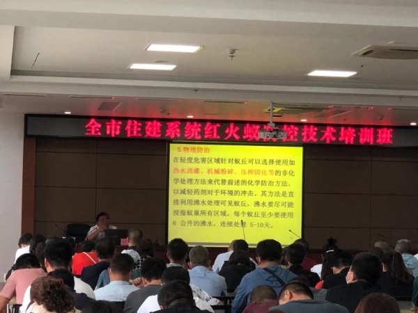 为了进一步提高我市园林绿化建设管理养护人员对红火蚁的识别能力及防控技术水平,保障生态环境和人民生命安全。7月16日,市住建局举办了红火蚁防控技术培训班。各县区住建局、经济开发区规划建设局、园林建设服务中心、市城投公司、秦州区环卫中心、天水湖管理处和翠湖公园等单位的分管领导、技术人员及绿化工程施工单位相关人员,共150余人参加了此次培训。