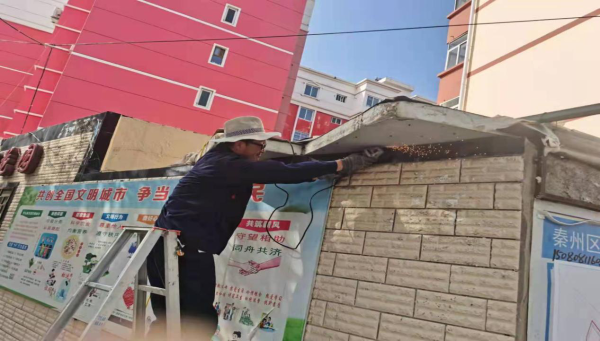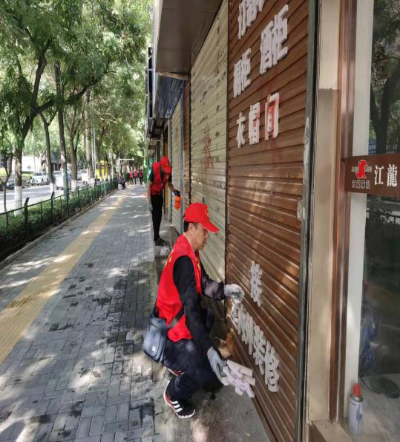 对张贴小广告的商铺墙体进行铲除,清洗擦拭公益广告牌。