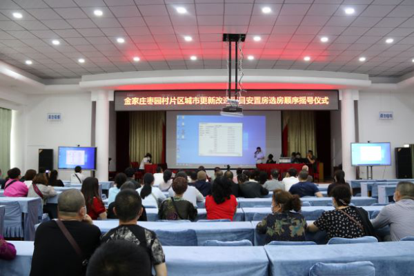 6月20日上午,金家庄枣园村片区城市更新改造项目安置房选房顺序摇号仪式在市委党校礼堂举行,市公证处、项目点干部及金家庄村民200余人参加。