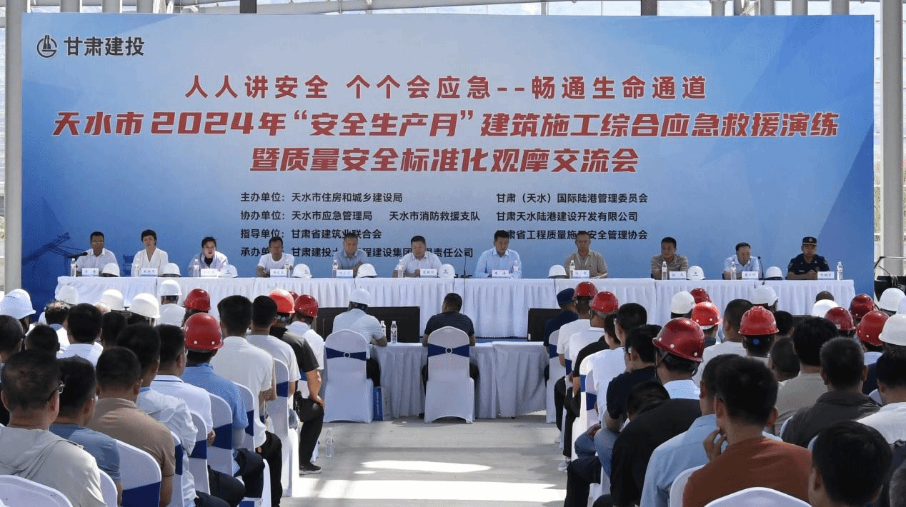为深入贯彻落实习近平总书记关于安全生产重要论述及重要指示批示精神,推进2024年全国“安全生产月”活动走深走实。6月25日,由天水市住房和城乡建设局、甘肃(天水)国际陆港管理委员会主办,市应急管理局、市消防救援支队、甘肃天水陆港建设开发有限公司协办,甘肃建投土木工程建设集团有限责任公司承办的2024年“安全生产月”建筑施工综合应急救援演练暨质量安全标准化观摩活动在天水市甘肃(天水)国际陆港保税物流中心(B 型)建设项目(一期)顺利举行。甘肃省建筑业联合会、甘肃省工程质量施工安全管理协会对本次活动进行指导。市住建局、甘肃(天水)国际陆港管理委员会、市应急局、市消防救援支队、秦州区住建局、麦积区住建局、甘肃建投土木工程建设集团有限责任公司及有关建设、施工、监理企业相关负责人共计300余人现场参加活动,同时本次活动通过视频直播的方式组织各县区主管部门及相关单位线上参与,线上参与人员2900余人。