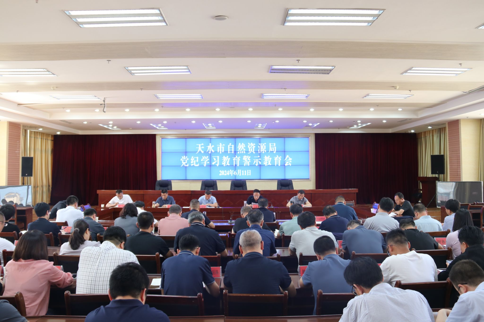 6月11日上午,天水市自然资源局召开党纪学习教育警示教育会,会议深入学习贯彻习近平总书记关于全面加强党的纪律建设的重要论述,观看警示教育片,通报并剖析自然资源领域违纪典型案例,以案说德、以案说纪、以案说法、以案说责,教育警示全系统党员干部学纪、知纪、明纪、守纪,推动全市自然资源工作提质增效。