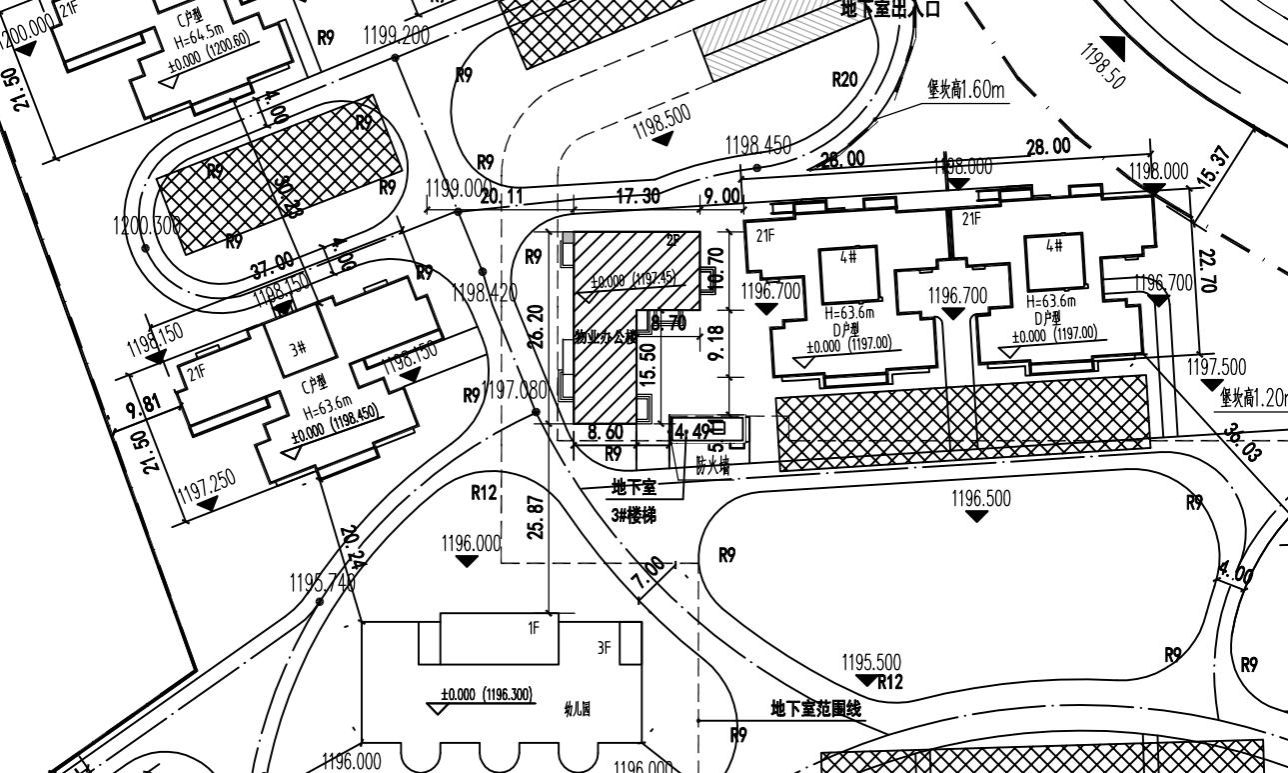 拟新建物业用房位于4#楼西侧,二层框架结构,总建筑面积约636.82平方米,建筑高度约8.2米(拟新建物业用房平面图附后)。