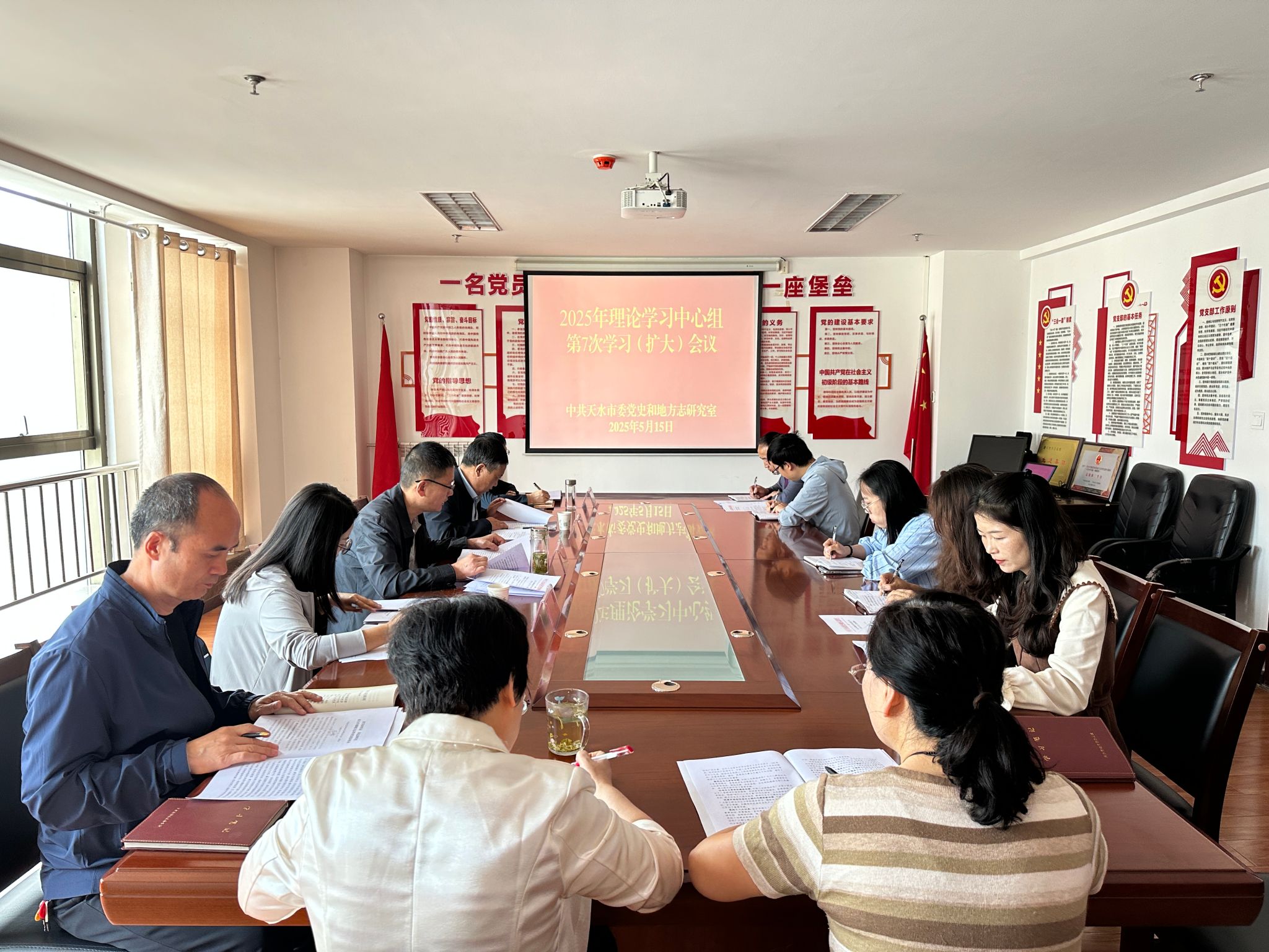 5月15日,天水市委党史和地方志研究室召开理论学习中心组2025年第7次学习(扩大)会议。室主任彭德川主持会议,市委直属机关工委二级调研员、列席旁听指导组组长任玉璞,成员李转萍列席旁听指导,室班子成员及各科室负责人参加会议。