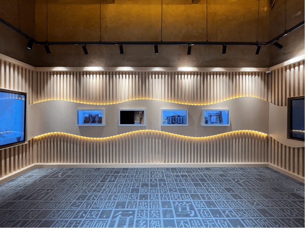 入口左侧南厢房为展馆第一部分“党之誓”,左侧墙面为解放天水浮雕,正墙、右墙墙面为红军长征浮雕,正堂主要是展陈地台加党旗,旁边立有入党誓词;地面有星火燎原互动影片及动态演示,当人们踩到上面时,就会显示出星星之火。
