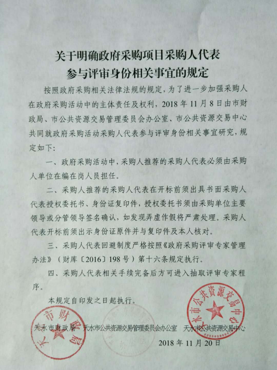 按照政府采购相关法律法规的规定,为了进一步加强采购人在政府采购活动中的主体责任及权利,2018年11月8日由市财政局、市公共资源交易管理委员会办公室、市公共资源交易中心共同就政府采购活动采购人代表参与评审身份相关事宜研究,规定如下: