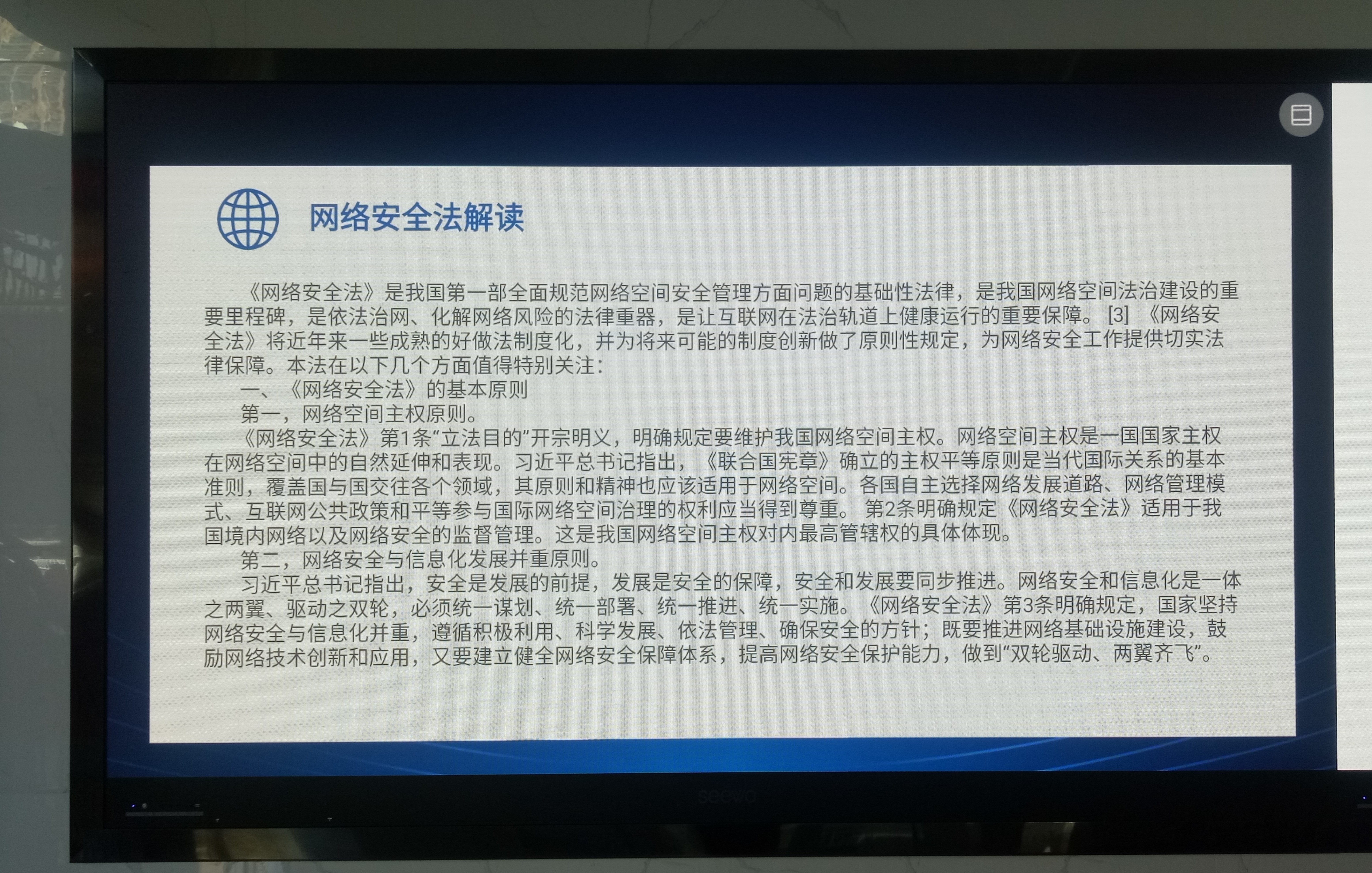 按照中心安排,在中心一楼LED大屏上对习近平总书记网络强国战略思想,市委书记张永霞对网络安全宣传周工作批示,以及《网络安全法》《个人信息保护法》进行宣传,深化干部职工对于网络安全的认识和理解,切实增强维护网络安全的意识,增强广大干部职工网络安全意识和基本防护技能。
