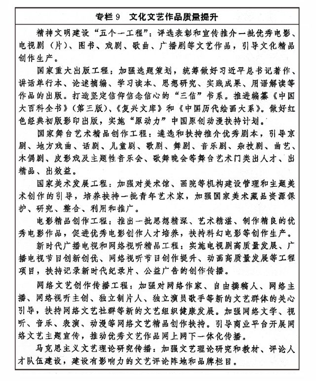 提高组织化程度,实施文艺作品质量提升工程,支持当代文学艺术创作,发挥重点选题、重大项目的引领带动作用,推动文艺创作从“高原”迈向“高峰”。加强对文学、戏剧、电影、电视、音乐、舞蹈、美术、摄影、书法、曲艺、杂技以及民间文艺、群众文艺等创作的规划引导。抓好重大现实题材、重大革命和历史题材、新时代发展题材、国家重大战略题材、爱国主义题材、青少年题材、军事题材的创作生产,推出更多讴歌党、讴歌祖国、讴歌人民、讴歌新时代、讴歌英雄的精品力作。建立重点创作项目跟踪推进机制,加强全流程质量管理。抓好源头原创,推动创作重心和扶持资源向前端、源头倾斜,推动好的文学作品向剧本转化,打造优秀原创剧本。制定实施电影、电视剧、纪录片创作重点选题规划,建立滚动式、可持续的创作生产机制,提高原创能力和工业化水平。制定实施出版物重点选题规划和古籍工作中长期规划,做好重大主题和重点出版物出版。推动学术期刊繁荣发展。