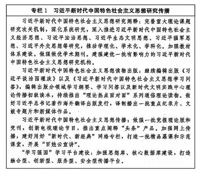 把学习宣传贯彻习近平新时代中国特色社会主义思想作为长期重大政治任务,完善持续深入学习的常态化长效化机制,健全用党的创新理论武装全党、教育人民的工作体系。编辑出版习近平总书记系列重要著作。加强对习近平新时代中国特色社会主义思想整体性系统性研究、学理性阐释和学科性建设,加强对实现马克思主义中国化新的飞跃的重大原创性贡献的研究阐释宣传。持续开展中国特色社会主义和中国梦宣传教育。完善党委(党组)理论学习中心组等各层级学习制度,组织开展列席旁听和督促检查。持续开展党员大规模轮训。综合运用全媒体方式、大众化语言、艺术化形式,结合党治国理政的生动实践和历史性成就,全方位、多层次开展对象化、分众化、互动化理论宣传普及。创新高等学校思政课内容和方式,鼓励文化名家讲思政课,打造思政精品课程,推动党的创新理论进教材、进课堂、进学生头脑。