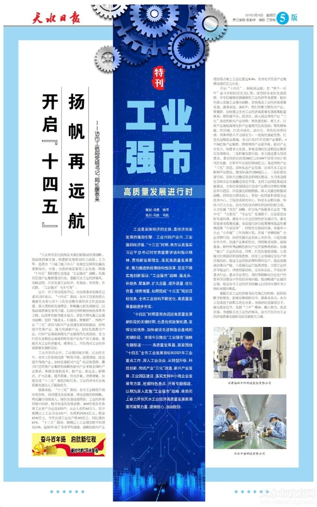 “工业和信息化战线是实施创新驱动发展战略、推动高质量发展、构建新发展格局的主战场、主力军,是我市‘三城三地三中心’发展定位顺利实施的重要依托。市委、市政府高度重视工业发展,明确‘十四五’期间要扎实推进‘工业强市’战略、实施百亿级产业集群建设行动,重振天水工业经济雄风。实践证明,天水发展工业经济,有基础、有优势、有出路,‘工业强市’大有可为”。 近日,市工信局党组书记、局长康泰来在接受记者采访时表示,“十四五”期间,全市工信系统将认真落实市委七届十三次全会暨市委经济工作会议部署,深入贯彻新发展理念,积极融入新发展格局,以推动高质量发展为主题,以深化供给侧结构性改革为主线,以改革创新为根本动力,坚定不移实施工业强市战略;坚持“强龙头、补链条、聚集群”,传统产业“三化”改造与新兴产业提速发展双轮驱动,持续提升优势产业,强力突破新产业,加快发展潜力产业,打好产业基础高级化产业链现代化攻坚战,全力打造先进制造业基地和特色农产品生产加工基地,重振天水工业经济雄风,乘势而上,开创我市工业经济高质量发展新局面。