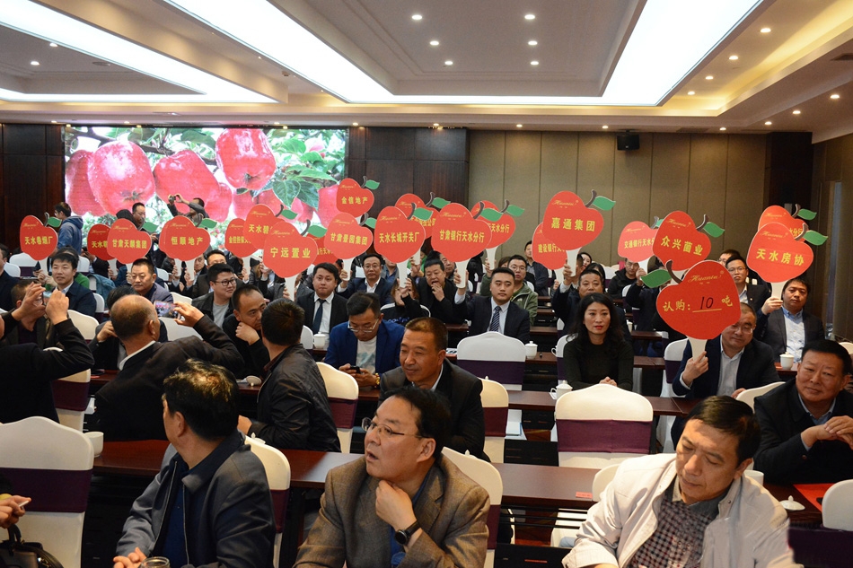 活动现场,各企业为获奖建档立卡贫困户、合作社生产的花牛苹果进行现场举牌爱心认购,认购数额较大的卷烟厂、众兴菌业、长城开关厂等6户工业企业共认购花牛苹果33吨,价值约33万元,占现场认购总额的近三分之一。