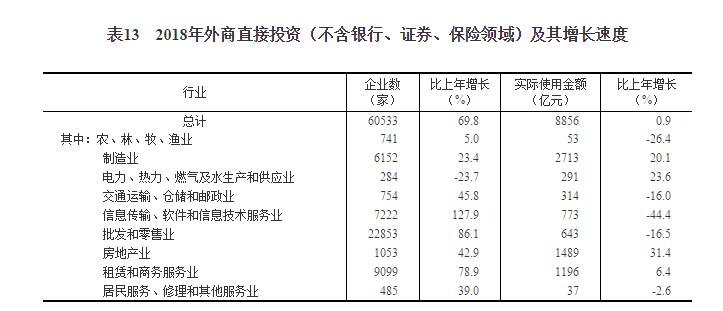全年外商直接投资(不含银行、证券、保险领域)新设立企业60533家,比上年增长69.8%。实际使用外商直接投资金额8856亿元,增长0.9%,折1350亿美元,增长3.0%。其中“一带一路”沿线国家对华直接投资新设立企业4479家,增长16.1%;对华直接投资金额424亿元,增长13.2%,折64亿美元,增长16.0%。全年高技术制造业实际使用外资898亿元,增长35.1%,折137亿美元,增长38.1%。