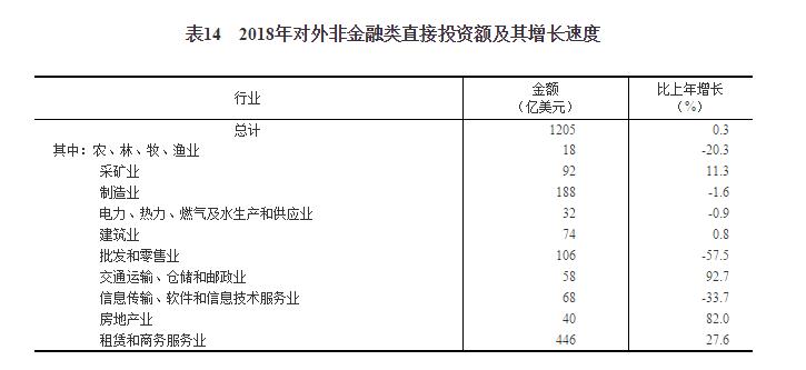 全年对外非金融类直接投资额7974亿元,比上年下降1.6%,折1205亿美元,增长0.3%。其中,对“一带一路”沿线国家非金融类直接投资额156亿美元,增长8.9%。