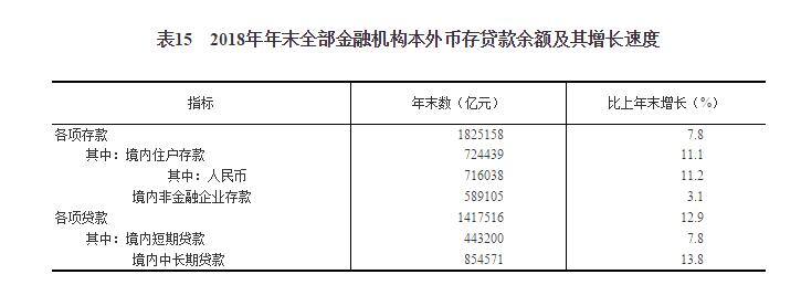 全年社会融资规模增量[51]19.3万亿元,按可比口径计算,比上年少3.1万亿元;年末社会融资规模存量[52]200.7万亿元,比上年末增长9.8%。年末全部金融机构本外币各项存款余额182.5万亿元,比年初增加13.2万亿元,其中人民币各项存款余额177.5万亿元,增加13.4万亿元。全部金融机构本外币各项贷款余额141.8万亿元,增加16.2万亿元,其中人民币各项贷款余额136.3万亿元,增加16.2万亿元。