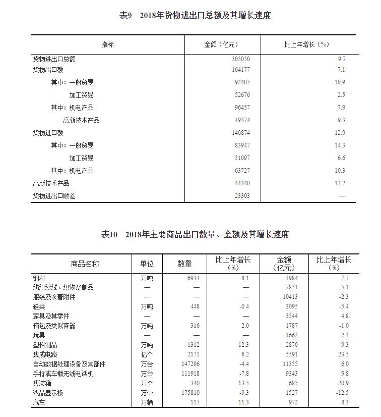 全年货物进出口总额305050亿元,比上年增长9.7%。其中,出口164177亿元,增长7.1%;进口140874亿元,增长12.9%。货物进出口顺差23303亿元,比上年减少5217亿元。对“一带一路”[49]沿线国家进出口总额83657亿元,比上年增长13.3%。其中,出口46478亿元,增长7.9%;进口37179亿元,增长20.9%。