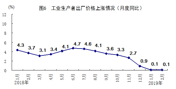 1-2月份,全国工业生产者出厂价格同比上涨0.1%,涨幅比上年12月份回落0.8个百分点。分月看,1、2月份全国工业生产者出厂价格同比均上涨0.1%,环比分别下降0.6%和0.1%。1-2月份,全国工业生产者购进价格同比上涨0.1%,比上年12月份回落1.5个百分点。