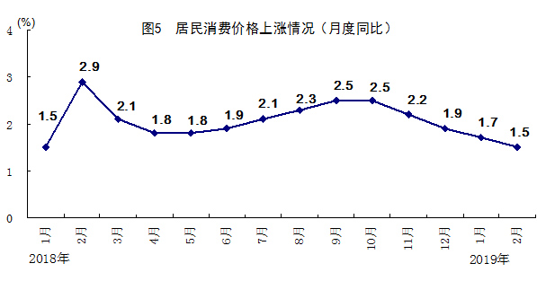 1-2月份,全国居民消费价格同比上涨1.6%,涨幅比上年12月份回落0.3个百分点。分类别看,食品烟酒价格同比上涨1.6%,衣着上涨1.8%,居住上涨2.1%,生活用品及服务上涨1.4%,交通和通信下降1.2%,教育文化和娱乐上涨2.6%,医疗保健上涨2.7%,其他用品和服务上涨2.1%。在食品烟酒价格中,粮食价格同比上涨0.5%,猪肉价格下降4.1%,鲜菜价格上涨2.6%。分月看,1、2月份全国居民消费价格同比分别上涨1.7%和1.5%,环比分别上涨0.5%和1.0%。