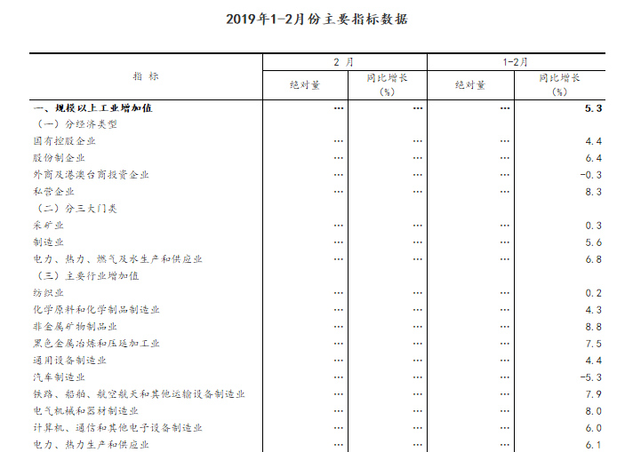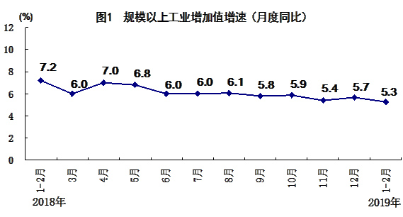 1-2月份,全国规模以上工业增加值同比增长5.3%,增速比上年12月份回落0.4个百分点。据测算,剔除春节因素,1-2月份全国规模以上工业增加值同比增长6.1%。从环比看,2月份全国规模以上工业增加值比上月增长0.43%。1-2月份,分经济类型看,国有控股企业增加值同比增长4.4%,股份制企业增长6.4%,外商及港澳台商投资企业下降0.3%。分三大门类看,采矿业增加值同比增长0.3%,制造业增长5.6%,电力、热力、燃气及水生产和供应业增长6.8%。战略性新兴产业增加值同比增长10.1%,增速快于全部规模以上工业4.8个百分点。新能源汽车产量同比增长53.3%,比上年12月份提高37.8个百分点;太阳能电池产量增长13.5%,提高0.4个百分点。1-2月份,发电量同比增长2.9%,2月份增长6.8%。2月份,制造业采购经理指数中新订单指数为50.6%,比上月上升1.0个百分点,市场预期出现向好趋势。