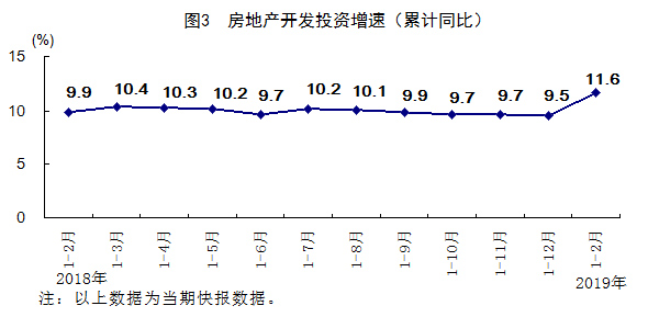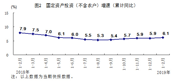 1-2月份,全国固定资产投资(不含农户)44849亿元,同比增长6.1%,增速比上年全年加快0.2个百分点。其中,民间投资26963亿元,增长7.5%。分产业看,第一产业投资同比增长3.7%;第二产业投资增长5.5%,其中制造业投资增长5.9%;第三产业投资增长6.5%,增速比上年全年加快1.0个百分点,其中基础设施投资增长4.3%。高技术产业投资、工业技术改造投资同比分别增长8.6%和19.5%,增速分别快于全部投资2.5和13.4个百分点。1-2月份,全国房地产开发投资12090亿元,同比增长11.6%;全国商品房销售面积14102万平方米,下降3.6%;全国商品房销售额12803亿元,增长2.8%。从环比看,2月份固定资产投资比上月增长0.43%。