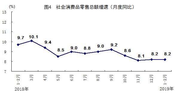 1-2月份,社会消费品零售总额66064亿元,同比增长8.2%,增速与上年12月份持平。按经营单位所在地分,城镇消费品零售额56210亿元,同比增长8.0%;乡村消费品零售额9854亿元,增长9.1%。按消费类型分,餐饮收入7251亿元,增长9.7%;商品零售58813亿元,增长8.0%。升级类商品消费增速较快。1-2月份,限额以上单位商品零售额中,书报杂志类、化妆品类、文化办公用品类同比分别增长33.9%、8.9%和8.8%,增速分别比社会消费品零售总额快25.7、0.7和0.6个百分点。1-2月份,全国网上零售额13983亿元,同比增长13.6%。其中,实物商品网上零售额10901亿元,增长19.5%,占社会消费品零售总额的比重为16.5%,比上年同期提高1.6个百分点。从环比看,2月份社会消费品零售总额比上月增长0.81%。