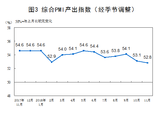 2018年11月份,综合PMI产出指数为52.8%,比上月回落0.3个百分点,表明我国企业生产经营活动继续保持扩张,但活跃度有所减弱。