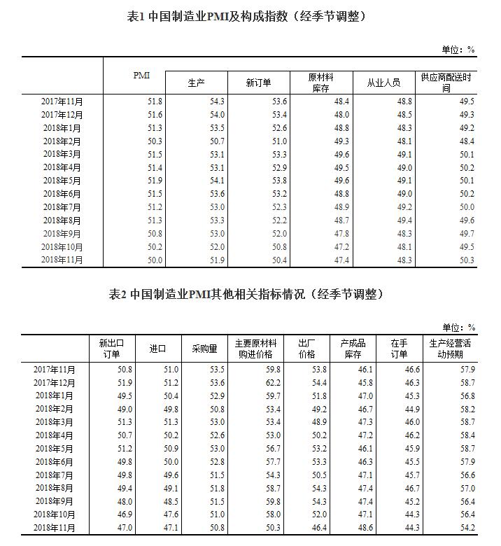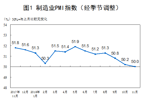 2018年11月份,中国制造业采购经理指数(PMI)为50.0%,比上月小幅回落0.2个百分点,处于临界点。