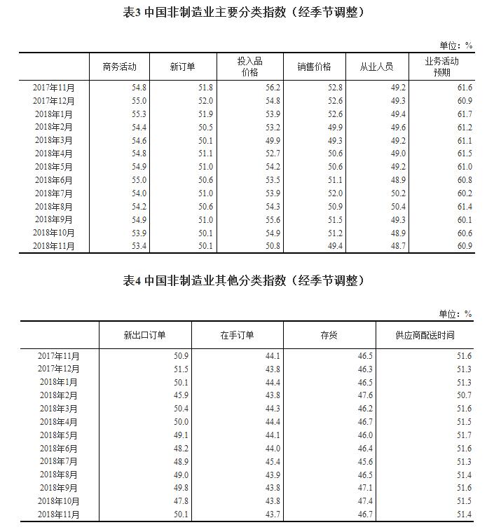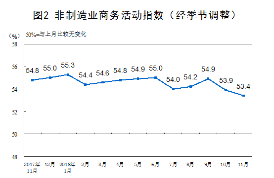 2018年11月份,中国非制造业商务活动指数为53.4%,比上月回落0.5个百分点,表明非制造业增长有所放缓,但仍在扩张区间。