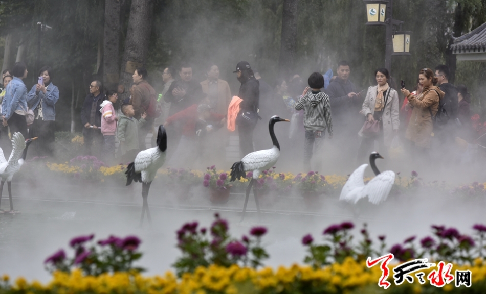 沐着天水秋雨渐落渐歇的节奏,“陇上江南”天水对于季节的敏感着实没有半点含糊,秋高气爽的让人觉得有些“酸爽”,然而在马跑泉公园,这里却是另外一番景象。人如织,景如画,秋菊吐蕊胜春花。三三两两的游人或观雾里秋韵,或赏金菊吐蕊,或享自拍自乐。