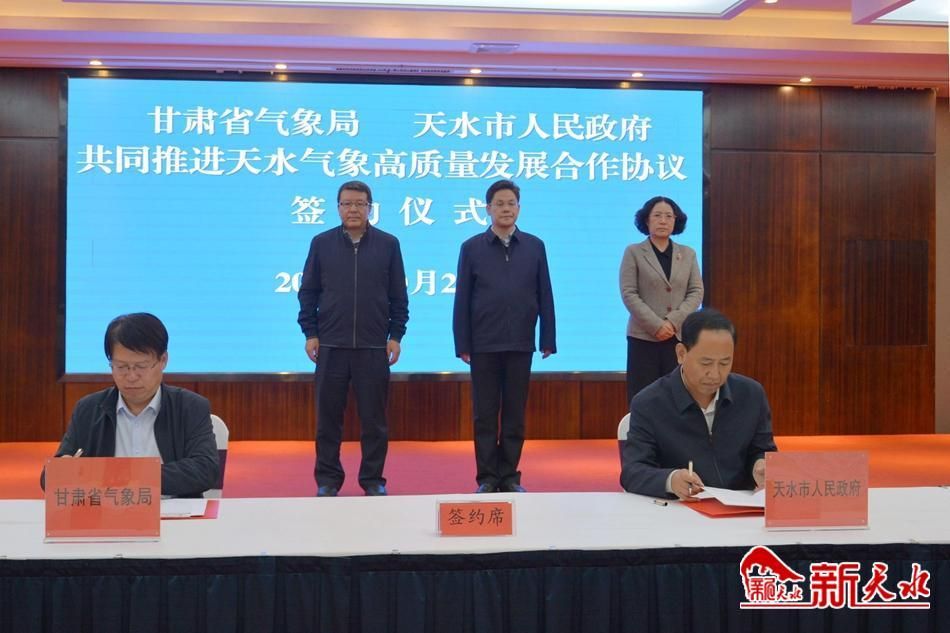 10月29日,天水市政府与甘肃省气象局签订推进天水气象高质量发展合作协议。市委副书记、市长王国先主持签约仪式。省气象局局长杨兴国、市政协主席王燕为“甘肃省果业气象服务中心”揭牌。省气象局副局长李照荣,副市长康泰来分别代表双方签订推进天水气象高质量发展合作协议。