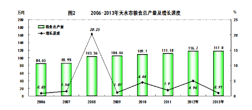 全市粮食作物播种面积469.61万亩,比上年增长0.43%。其中夏粮面积204.57万亩,下降0.23%;秋粮面积265.04万亩,增长0.94%。粮食产量117.76万吨,比上年增长0.91%。其中夏粮总产32.38万吨,下降7.9%;秋粮总产85.38万吨,增长4.71%。粮食亩产250.77公斤,比上年增长0.48%。其中夏粮亩产158.29公斤,下降7.68%;秋粮亩产322.16公斤,增长3.73%。小麦播种面积197.04万亩,比上年增长0.33%;亩产158.06公斤,下降8.31%;总产量31.14万吨,下降8.01%。玉米播种面积131.2万亩,比上年增长1.12%;亩产437.01公斤,增长5.57%;总产量57.34万吨,增长6.75%。洋芋播种面积102.27万亩,比上年增长0.92%;亩产228.98公斤,增长3.1%;总产量23.42万吨,增长4.04%。油料种植面积75.23万亩,比上年下降0.91%;产量7.8万吨,增长4.36%。蔬菜种植面积95.79万亩,比上年增长4%;产量217.12万吨,增长4.52%。药材种植面积16.84万亩,比上年增长5.78%;产量3.03万吨,增长5.11%。水果总产量105.16万吨,比上年增长8.64%。
