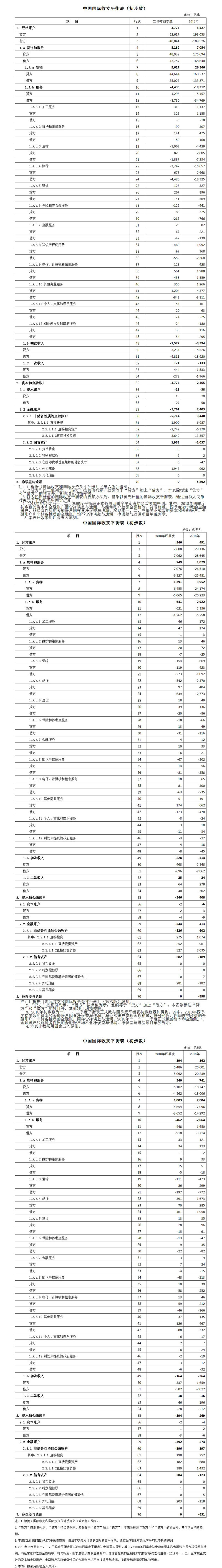 按美元计值,2018年四季度,我国经常账户顺差546亿美元,其中,货物贸易顺差1391亿美元,服务贸易逆差641亿美元,初次收入逆差228亿美元,二次收入顺差25亿美元。资本和金融账户逆差546亿美元,其中,资本账户逆差2亿美元,非储备性质的金融账户逆差826亿美元,储备资产减少282亿美元。