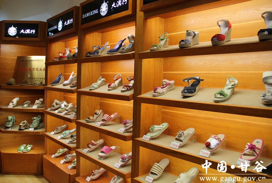 工艺麻鞋由纯麻编织而成。多用麻拧成辫,盘成麻鞋底垫,用麻绳左右穿紧,在底周边栽上较粗的精制麻绳,放成鞋帮子,一一串起来,再做上鼻梁,用木头楦子把鞋鼓起来。细麻鞋底子结实,帮子细密,鼻梁精制,还用白皮包边。除传绣的式样外,还有单边麻鞋与无鼻梁麻鞋等。甘谷麻织业历史悠久,改革开放以来,我县麻鞋业已渐由民户自产转入工厂生产。现在,鞋型多样(包括各式麻拖鞋),质量上乘的“大漠行”牌麻鞋驰名省内外。2015年,甘谷麻鞋“大漠行”喜获中国驰名商标。