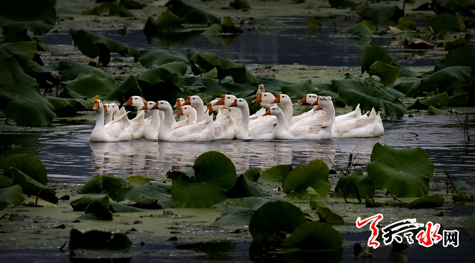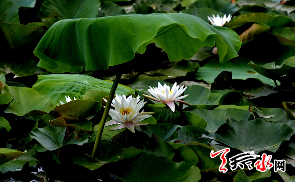 近日,天水湖一号坝区里的荷叶和睡莲迎来了盛开期,阳光下,一片绿油油莲叶上,白色的莲花星罗棋布地散开在其中,偶然见一两朵粉色点缀其间,显得格外抢眼,湖面清风过处,荷叶顺风齐摆,一幅夏荷清韵画卷徐徐展开,这时,盛夏的炎热顿觉随风而逝。(天天天水网 记者何永德摄)
