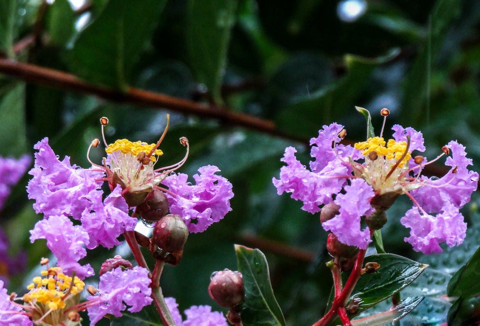 紫薇枝繁叶茂,色艳而穗繁,如火如荼,令人精神振奋。宋代诗人杨万里诗赞颂:“似痴如醉丽还佳,露压风欺分外斜。谁道花无红百日,紫薇长放半年花。” 明代薛蕙也写过:“紫薇花最久,烂熳十旬期,夏日逾秋序,新花续放枝。”