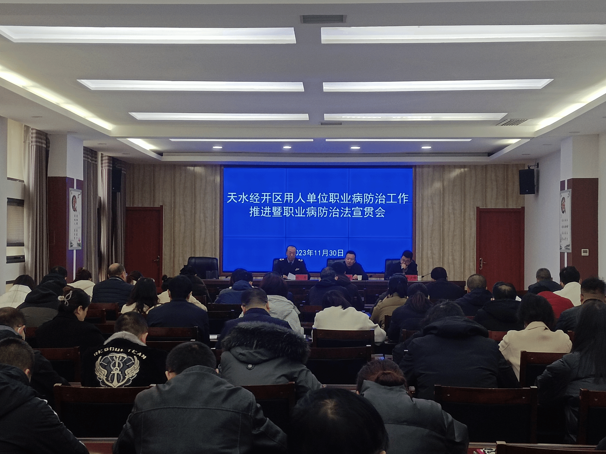 为进一步做好服务企业工作和宣传贯彻《职业病防治法》,优化经开区营商环境,提高企业对职业病防治的认识,保护劳动者的身体健康和合法权益,助力企业高质量发展。11月30日,天水经开区管委会联合天水市卫生监督所麦积分所举办了天水经开区用人单位职业病防治工作推进暨职业病防治法宣贯会。经开区管委会副主任李俊文参加会议并讲话,园区生产型企业负责人和卫生管理人员、市级职业卫生专家库专家、部分卫生监督员共计100余人参加了会议。