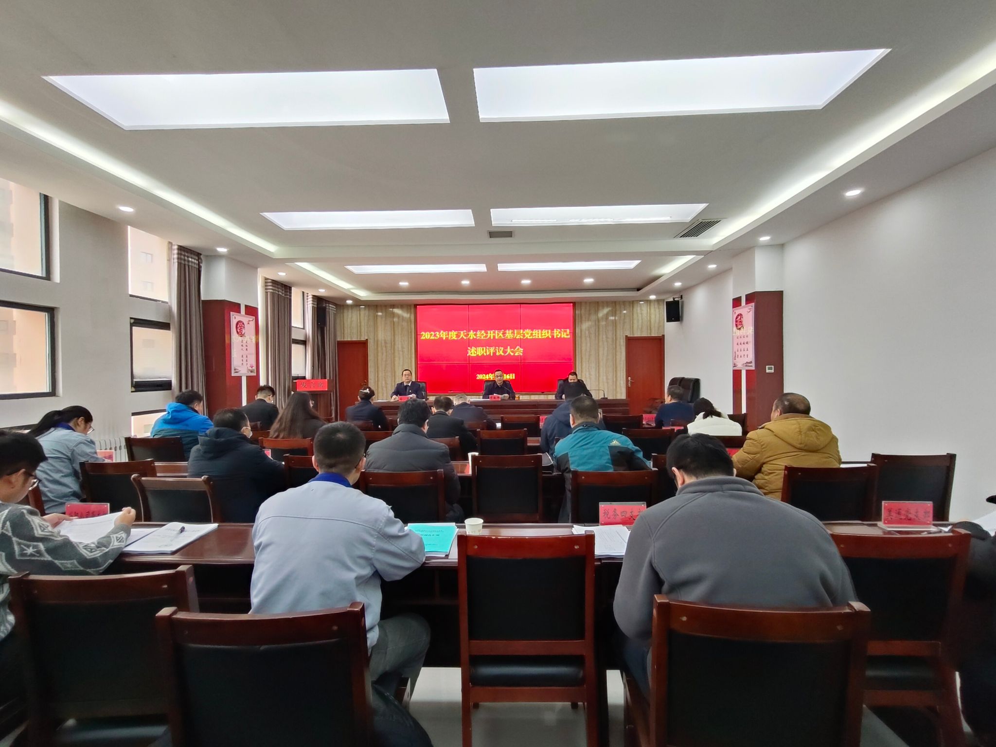 1月16日,天水经开区召开2023年度基层党组织书记述职评议大会,会议由党工委副书记、纪检监察工委书记、直属机关党委书记于爱平主持,经开区直属机关党委委员和下属21名基层党组织书记参加会议。